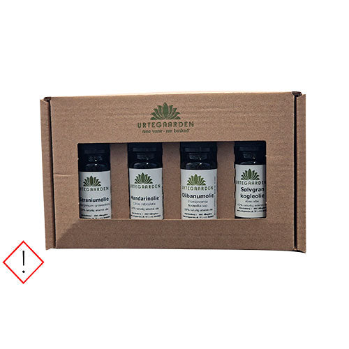 Om du gärna vill komma igång utan att själv behöva välja flera olika oljor finns det också färdiga set – till exempel Urtegaarden Saunagusset basis, som är ett saunagus-set med fyra eteriska oljor (apelsin, eukalyptus, tallbarr och lavendel – alla i 10 ml).