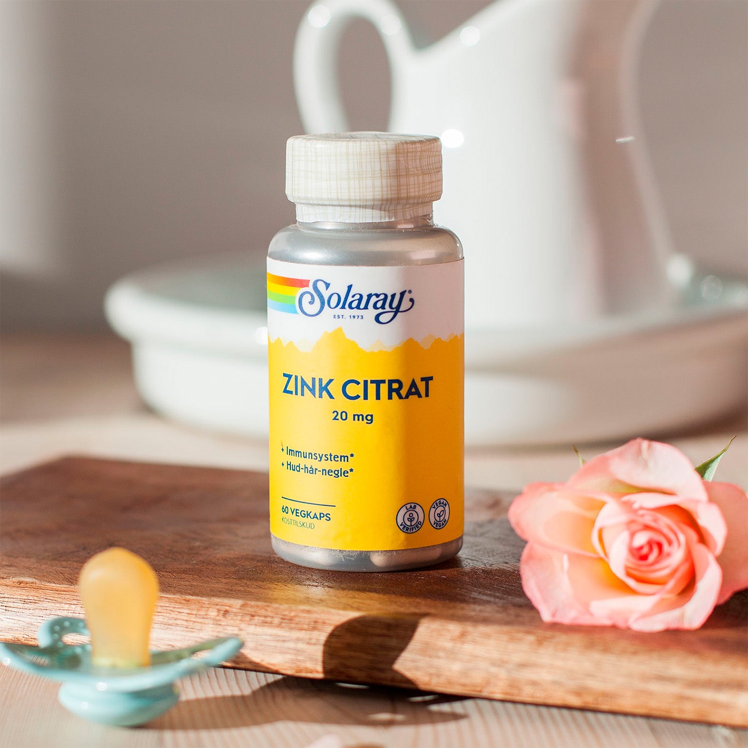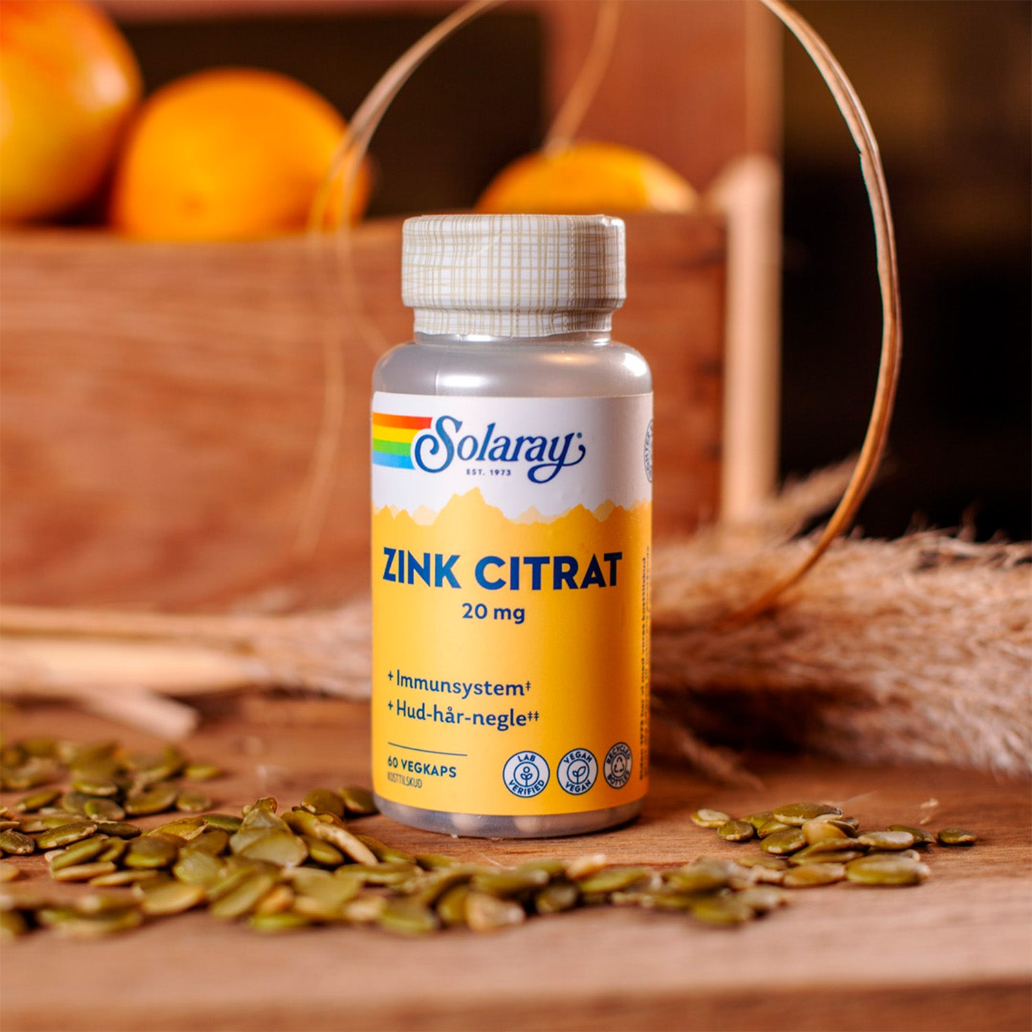 Solaray Zink Citrat innehåller en lättupptaglig form av zink som bidrar till immunsystemets normala funktion, samt till att hud, hår och naglar hålls i gott skick och att synen bibehålls. Kapslarna är vegetabiliska och skonsamma för magen, vilket gör dem väl lämpade för daglig användning som en del av en hälsosam livsstil.