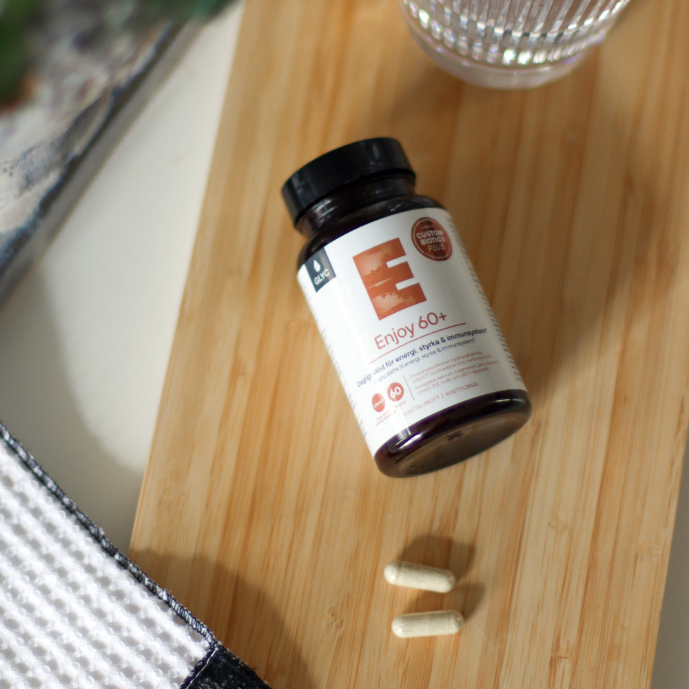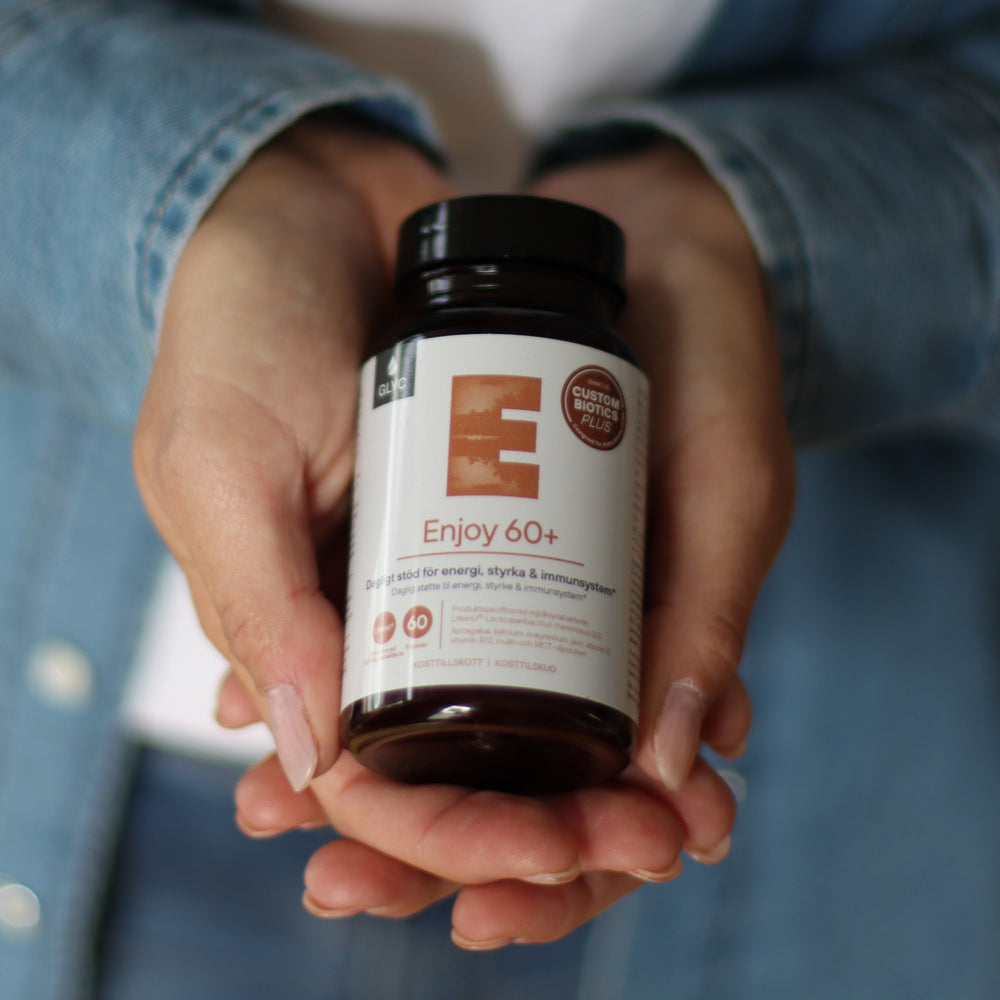 GLYC Enjoy 60+ er en daglig støtte til aktive mænd og kvinder, for vedligeholdelse af knoglerne og et velfungerende immunsystem. Indeholder den patenterede mælkesyrebakterie LifeinU™ (9 milliarder CFU). D-vitamin, calcium og magnesium bidrager til vedligeholdelse af normale knogler og en normal muskelfunktion. B12 og magnesium er med til at reducere træthed og udmattelse. Vitamin D bidrager til immunsystets normale funktion. Astragalus er en adaptogen, der støtter immunsystemet og hjælper med at opretholde et sundt kredsløb.